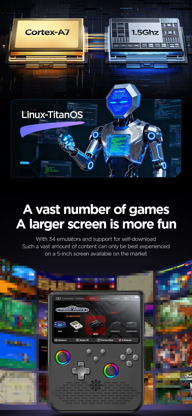 【Unmatched Portability & Playtime】Designed for gaming on the go, this handheld console is equipped with a 4,000mAh battery, ensuring hours of uninterrupted play. Play your favorite games anywhere, anytime, from home to travel, with this versatile Handheld Game Console.