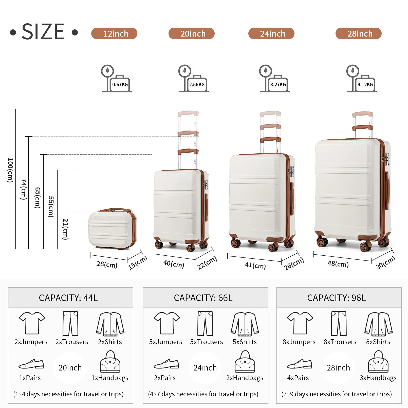 The interior of the suitcases is equipped with two spacious, fully lined compartments that allow efficient double-sided packing. The toilet bag has a mesh zipper bag that is ideal for cosmetics, toiletries and smaller personal items.Dimensions S 28x21x15cm 9 litre Capacity Weight 0.67 kg Dimensions M 55x40x22 cm Capacity 38 litres Weight 2.5 kg Dimensions L 65x41x26 cm Capacity 64 liters weight 3.1 kg Size XL 74x48x30 cm 100 litre Capacity Weight 4 kg Dimensions duffel bag 40x30x22cm Weight 0.64 kg Dimensions Toiletry bag 22x12x9cm Weight 0.11 kg Luggage can be inserted into each other, to maximize space savings. The 6-Piece Travel Set meets all your travel needs.
